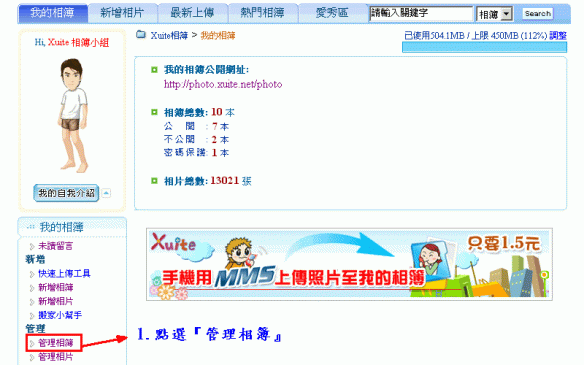 進入『Xuite相簿』 –>選擇『我的相簿』 –>輸入帳號、密碼 –>進入相簿功能選項。